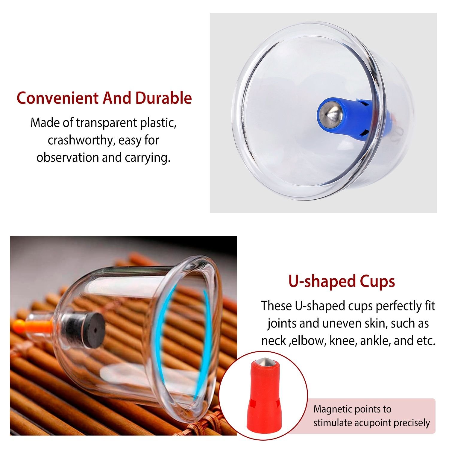 *Convenient & Crashworthy*:Cupping therapy is an ancient form of alternative medicine in which a therapist puts special cups on your skin for a few minutes to create suction. Compared with ceramic or glass cups; these plastic cuppings are more convenient to carry and crashworthy.